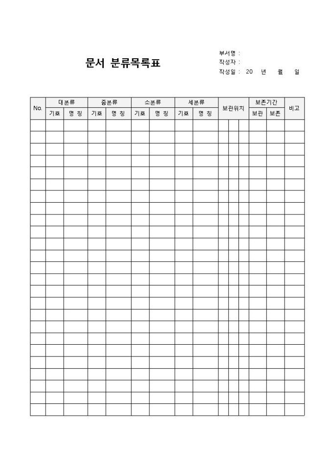 문서분류목록표입니다. 대분류, 중분류, 소분류, 세분류, 보관위치 등의 항목으로 구성되어 있습니다. 문서 분류 내역에 대해 관리할 경우 사용할 수 있는 양식입니다.
