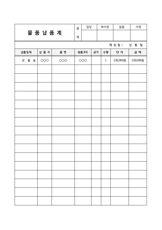 9,000원/월납품일자, 납품처, 품명, 상품코드, 수량, 단가, 금액 등의 항목으로 구성되어 기록하는 물품납품계 양식입니다. 물품을 납품할 때 쓰입니다.