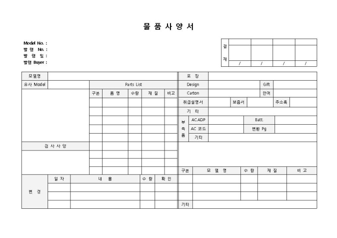 물품사양서 양식입니다. 모델명, 리스트, 취급서 등으로 구성되었으며, 사용자에게 내용 점검에 뛰어난 효과를 제공해주는 양식입니다.