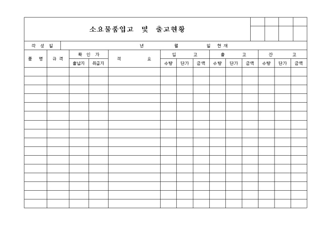 소요물품의 입고와 출고 현황을 기록하는 양식으로 출납자,취급자의 확인이 필요한 양식입니다.