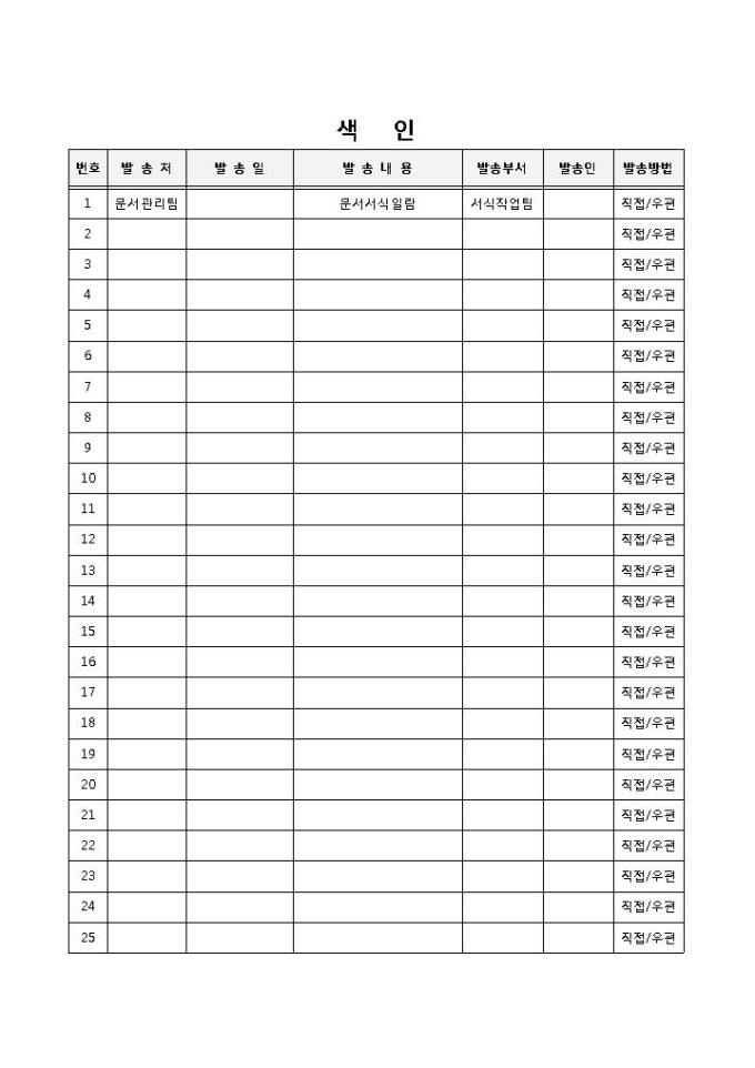 9,000원/월물품의 발송에 대해 색인 형식으로 된 발송공문서 양식입니다. 발송처, 발송일, 내용, 부서, 발송인, 발송방법 등의 항목으로 구성되어 있습니다.