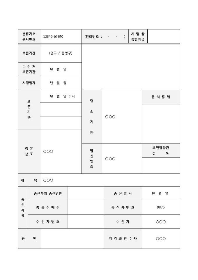 9,000원/월분류기호, 시행상특별취급, 보존기간, 시행일자, 협조기관, 문서통제 등의 항목으로 구성된 발송문서 기록대장 양식입니다. 문서 발송을 기록할 때 사용합니다.