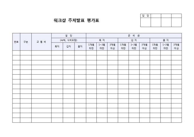 발표평가서(워크샵주제발표)입니다. 번호, 구분, 교통비, 일당, 준비 등의 항목으로 구성되어 있습니다. 워크샵 주제 발표에 대해 평가할 경우 사용할 수 있는 양식입니다.