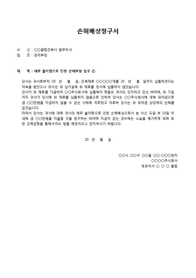 9,000원/월배상청구서입니다. 수신, 참조 등의 항목으로 구성되어 있습니다. 채무 불이행으로 인한 손해배상 청구 시 사용할 수 있는 양식입니다.