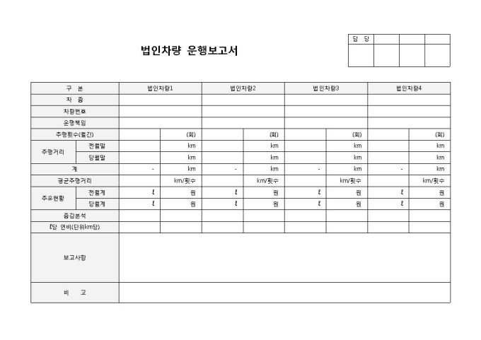 9,000원/월법인차량관리입니다. 차종, 차량번호, 운행책임, 주행횟수 등의 항목으로 구성되어 있습니다. 법인차량의 운행 내역을 보고할 경우 사용할 수 있는 양식입니다.