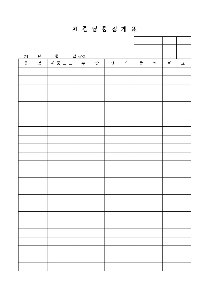 품명, 제품코드, 수량, 단가, 금액으로 구성된 제품납품집계표 양식입니다.