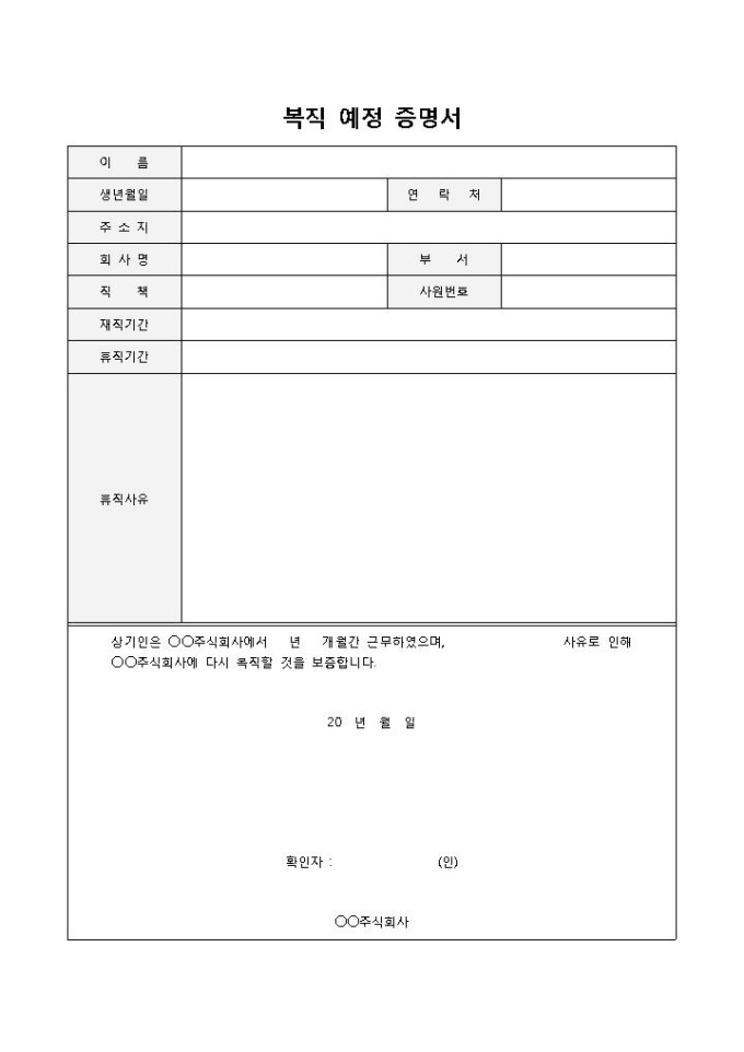 9,000원/월복직예정증명서 입니다. 이름, 생년월일, 주민등록번호, 연락처, 주소지, 회사명, 직책, 부서, 등으로 구성되었습니다. 휴직기간 및 휴직사유 확인에 용이한 양식입니다.