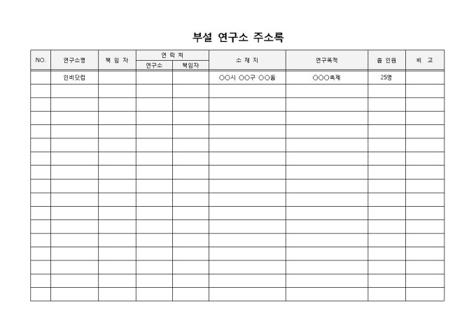 부설연구소 연락처 관리대장 입니다. 연구소명, 책임자, 연락처, 소재지, 연구목적 등으로 구성되었습니다. 책임자 및 연구소의 개별 연락처 확인에 용이하여, 상호소통 및 업무추진에 효과적입니다.