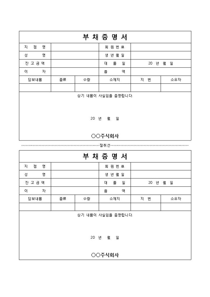 부채증명서 입니다. 지점명, 성명, 회원번호, 주민등록번호, 대출일, 총액, 이자 등으로 구성되었습니다. 담보내용 확인에 효과적입니다.