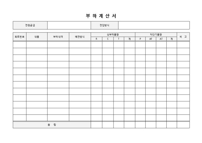 9,000원/월부하계산서 입니다. 전원공급, 전압방식, 회로번호, 내용, 부하내역, 배전방식, 상부하용량 등으로 구성되었스니다. 사용 용량에 따른 용량 총합 파악에 용이합니다.