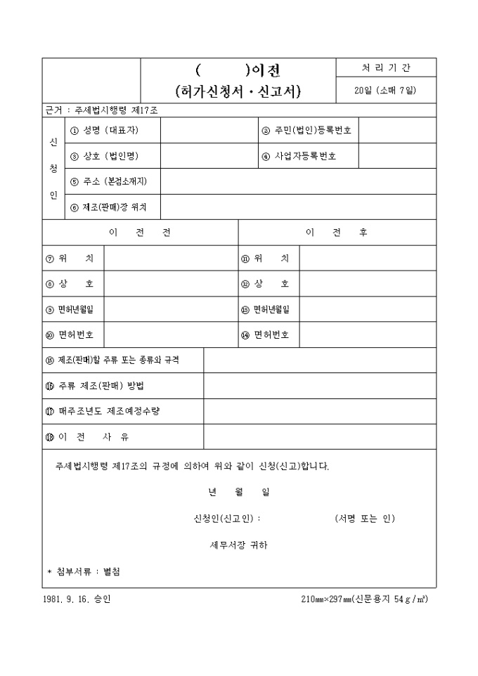 주세법시행령 제17조의 규정에 의하여 위와 같이 신청(신고)합니다.
