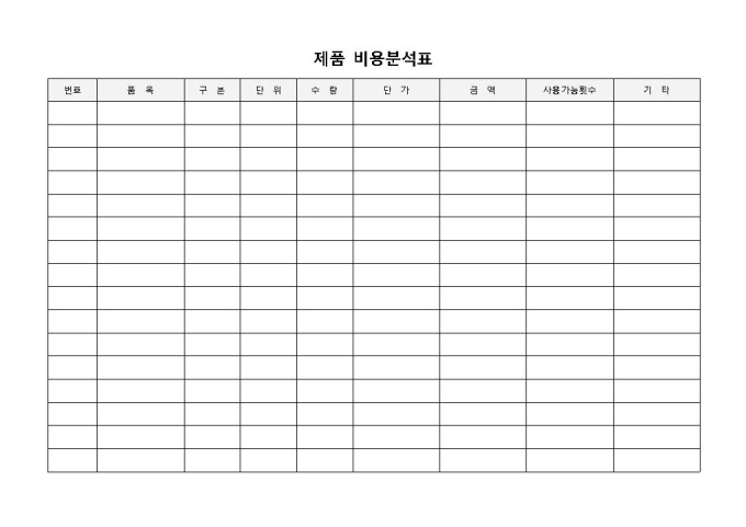 9,000원/월비용분석표(제품)입니다. 번호, 품목, 구분, 단위, 수량, 단가 등의 항목으로 구성되어 있습니다. 제품에 소요되는 비용에 대해 간략하게 분석하여 작성할 수 있는 비용분석표 양식입니다.