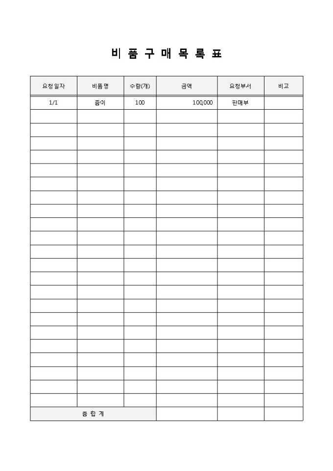 비품구매목록표입니다. 요청일자, 비품명, 수량, 금액, 요청부서, 비고로 구성되어 있습니다. 기업에서 비품에 대한 구매 목록표로 작성하여 사용할 수 있습니다.