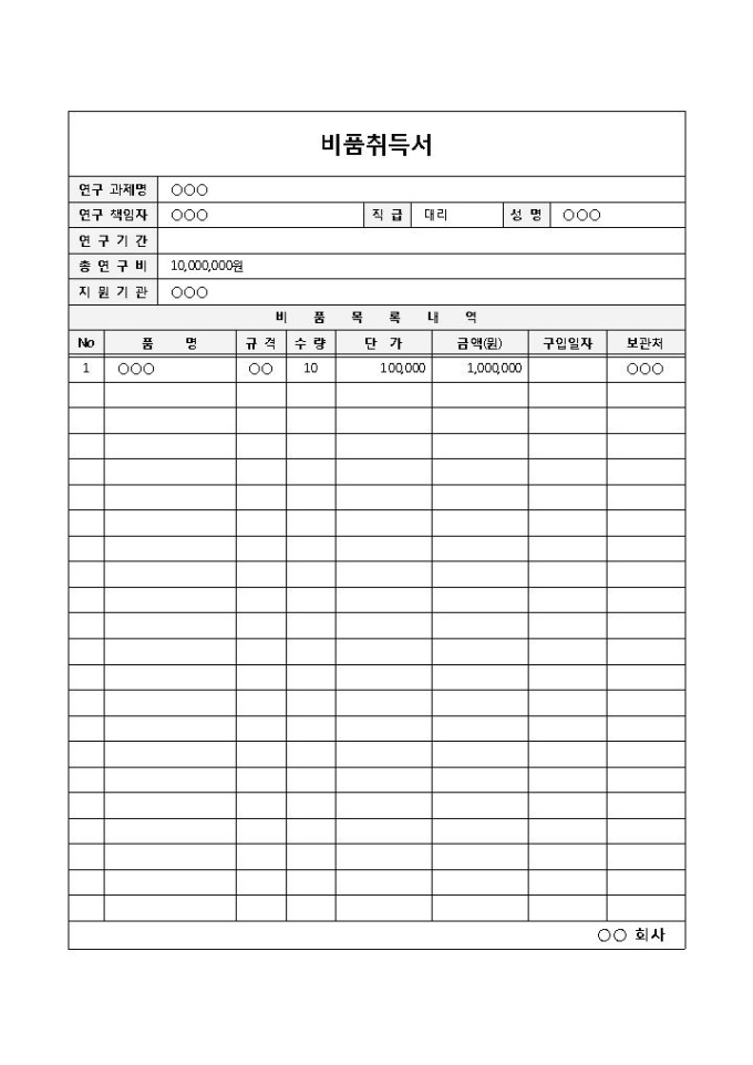 9,000원/월연구를 위해서 사용되는 비품의 취득을 위해 목록내역을 나열하고 수량, 단가, 금액, 구입일자 등을 기록할 때 사용되는 비품취득서 양식입니다. 연구과제명, 연구책임자, 직급, 성명, 연구기간, 총연구비, 지원기관, 비품목록내역 등의 항목으로 구성되어 있습니다.