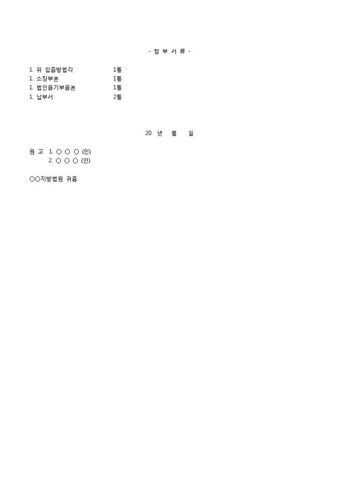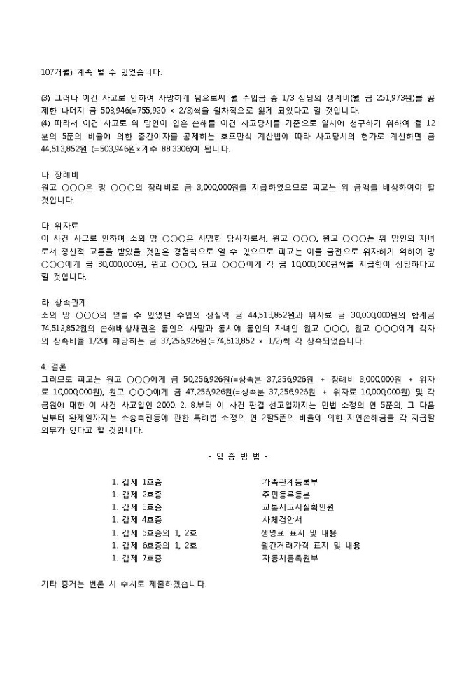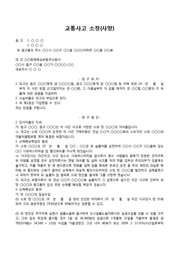 사망교통사고입니다. 모의 교통사고로 인한 사망에 대하여 운전자에게 위자료 및 장례비를 지급하라는 내용의 소장양식입니다.