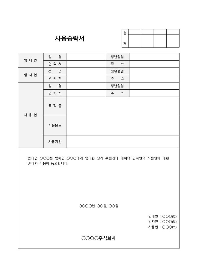 9,000원/월사용승낙서 입니다. 임대인, 임대차, 사용인, 목적물, 사용용도, 사용기간, 주민등록번호, 주소 등으로 구성되었습니다. 신청자 사용하고자 하는 목적물의 사항 및 사용용도 등을 간편하게 기재할 수 있습니다.