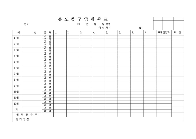 달별로 구입해야하는 물품의 수량,금액을 정리하여 기록하는 표입니다.