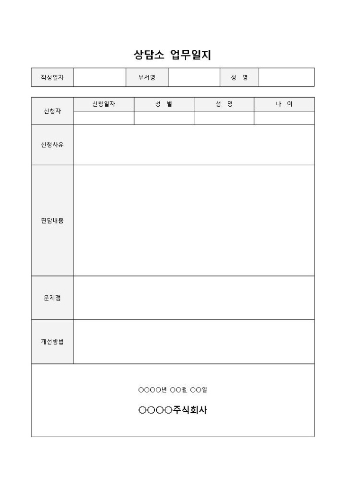 9,000원/월상담소 업무일지 입니다. 신청일자, 성별, 성명, 나이, 신청사유, 면담내용 등으로 구성되었습니다. 신청자의 문제점을 기록하고 그에 따른 개선방법을 작성하기에 용이합니다.