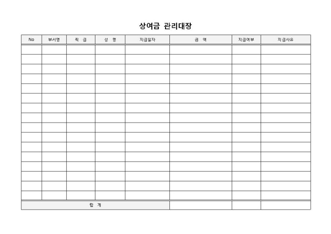 9,000원/월상여금 지급대장 입니다. 부서명, 직급, 성명, 지급일자, 금액, 지급여부, 지급사유 등으로 구성되었습니다. 인원별 지급내역 및 지급여부 파악에 용이합니다. 상여금 지급사유를 간편하게 작성할 수 있습니다.