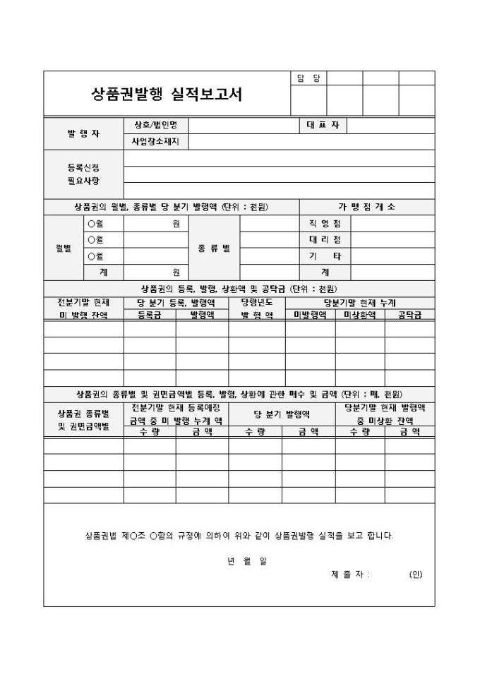 9,000원/월상품권 발행 후 그 실적의 보고서를 올릴 때 사용하는 상품권발행 실적보고서 양식입니다. 결재라인과 함께 발행자, 등록신청 필요사항, 월별, 종류별당 분기발행액 등의 항목으로 구성되어 있습니다.