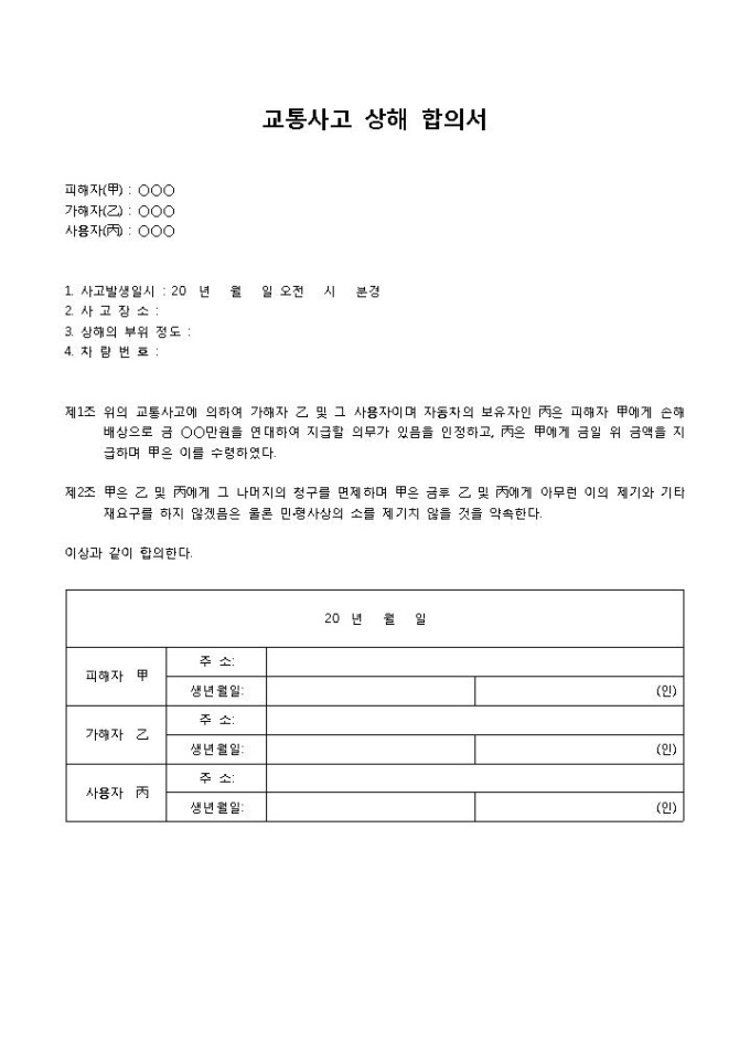 9,000원/월상해합의(교통사고)입니다. 피해자, 가해자, 사용자, 사고발생일시, 사고장소, 차량번호 등의 항목으로 구성되어 있습니다. 교통사고 상해 합의 시 일반적으로 사용할 수 있는 양식입니다.
