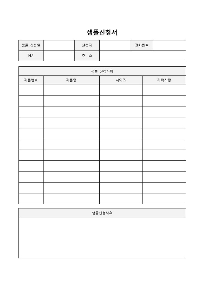 9,000원/월샘플신청서 입니다. 신청일, 집주소, 핸드폰번호, 샘플신청사항 등으로 구성되었습니다. 본인이 요청하고자 하는 샘플의 세부사항을 작성하고 그에 대한 신청사유를 기재할 수 있습니다.