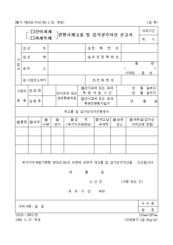 부가가치세법시행령 제74조의4의 규정에 의하여 재고품 및 감가상각자산을 신고할 때 쓰이는 양식입니다.