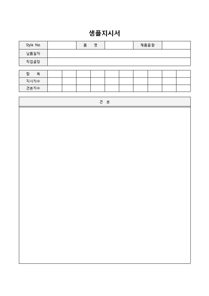 샘플지시서 입니다. 품명, 제품중량, 납품일자, 작업공장, 항목, 지시치수 등으로 구성되었습니다. 샘플의 예시사항을 작성하는데 편리한 양식입니다.