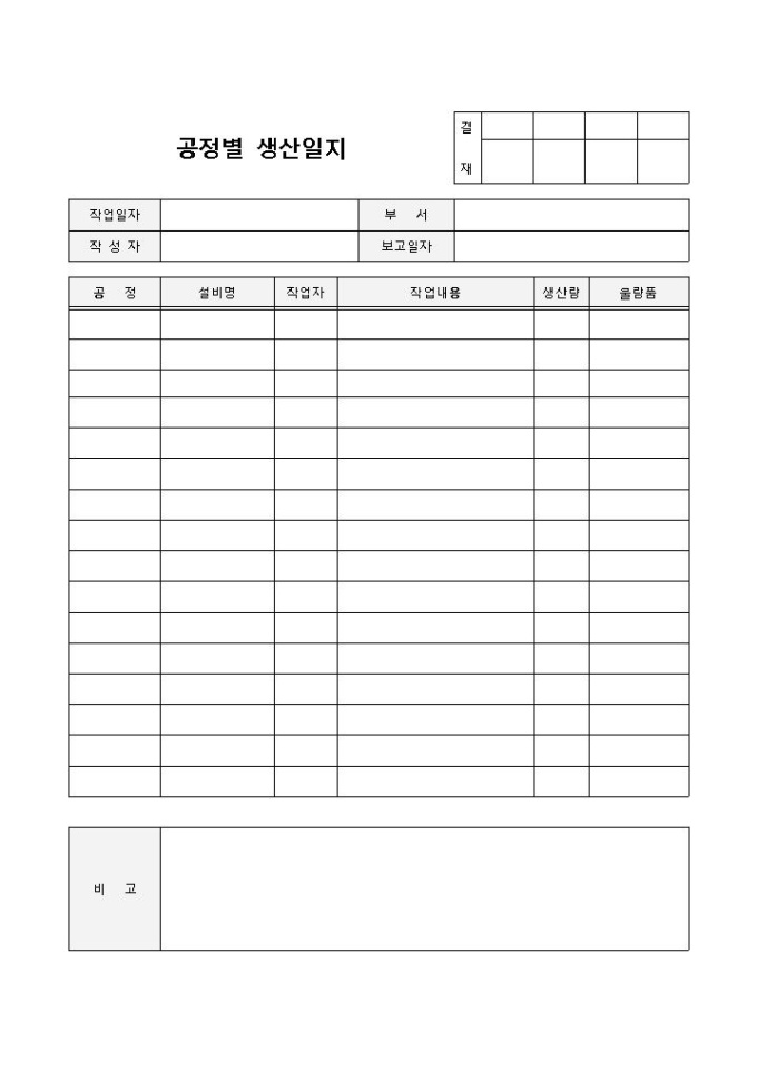 생산일지 입니다. 공정, 설비명, 작업자, 작업내용 등으로 구성되어있으며, 비고란을 통해 업무시 발생한 특이사항을 기록할 수 있습니다.
