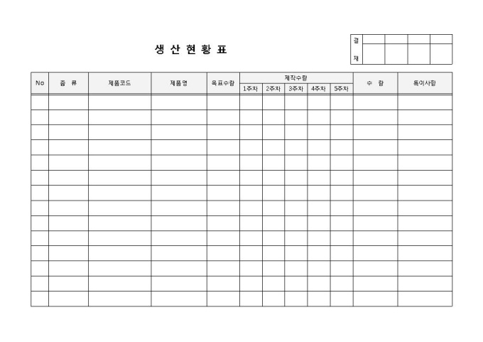 9,000원/월생산현황표 입니다. 종류, 제품코드, 제품명, 목표수량, 주차별 제작수량, 특이사항으로 구성되었습니다. 주차별 제작수량을 통해 목표량 파악 및 업무사항 작성에 용이한 양식입니다.