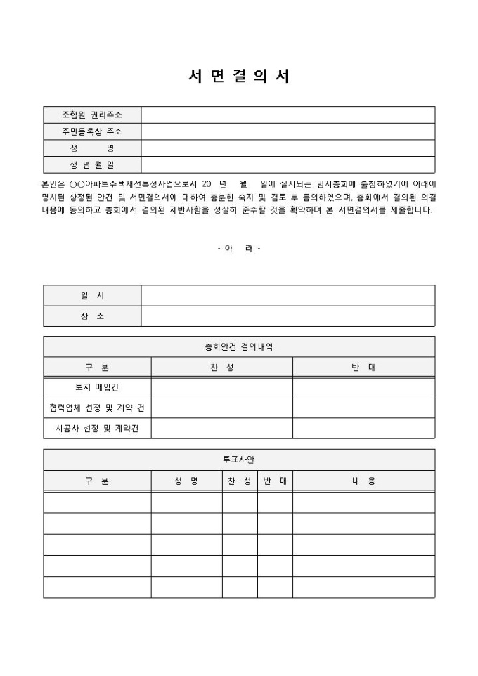 9,000원/월서면결의서 입니다. 조합원 권리주소, 주민등록상 주소, 성명, 주민등록번호, 투포사안 등으로 구성되었습니다. 총회결의내역을 확인하고 그에 대한 참석자의 의견을 기록할 수 있습니다.