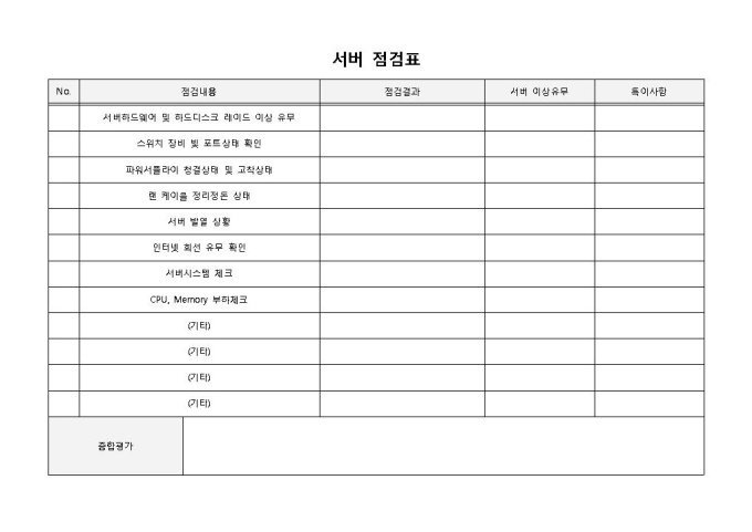 서버점검표 입니다. 점검내용, 점검결과, 서버이상 유무 등으로 구성되었습니다. 점검사항을 인수인계하는데 효과적입니다.