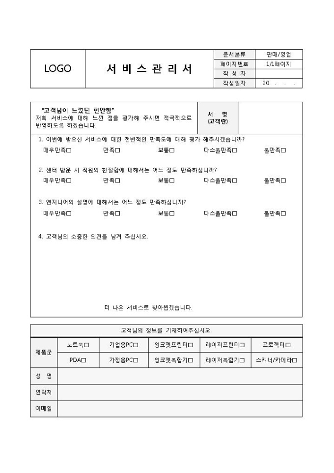 9,000원/월서비스관리서 입니다. 서명, 연락처, 메일, 체크사항 등으로 구성되었습니다. 서비스 만족도 파악를 파악하고 집계하는데 효과적입니다.