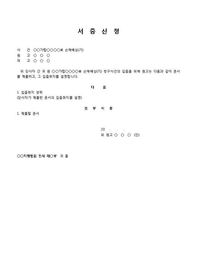서증신청서(손해배상)입니다. 손해배상 건에 대해 증거문서를 제출하고 입증취지를 설명하는 내용의 간단한 서증신청서 양식입니다.
