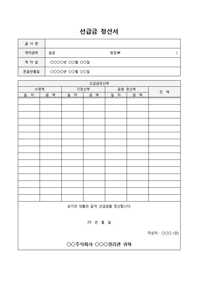 9,000원/월선급금정산서 입니다. 공사명, 계약금액, 계약일, 수령액, 기정산액, 잔액 등으로 구성되었습니다. 선급금 내역을 정산하고 경리관에게 보고하기에 용이합니다.