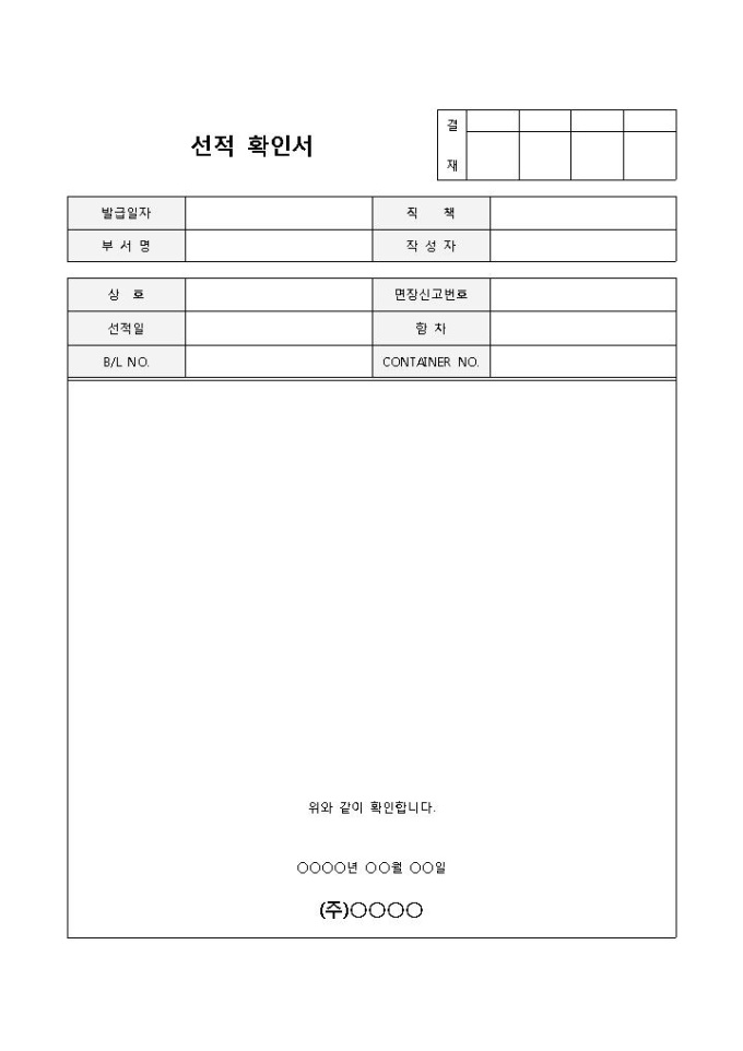9,000원/월선적확인서 입니다. 발급자, 부서명, 직책, 성명, 면장신고번호, 항차, 선적일 등으로 구성되었습니다. 선적사항을 간편하게 기재할 수 있습니다. 선적의 구성사항 및 내용기재에 용이합니다.