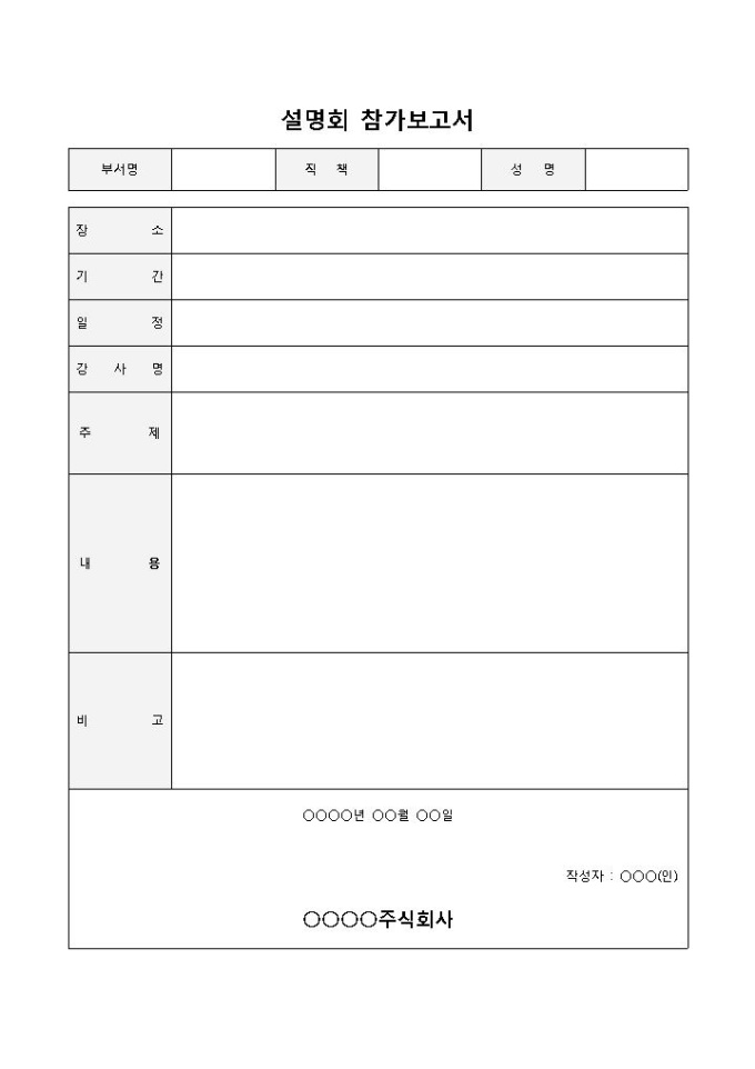 9,000원/월설명회 참가보고서 입니다. 작성자, 부서명, 기간, 장소, 내용, 강사명, 주제, 비고 등으로 구성되었습니다. 참가 설명회에 대한 대략적인 내용을 작성하고 그에 따른 특이사항 작성에 용이합니다.