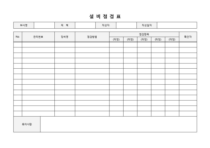 9,000원/월설비점검표 입니다. 관리번호, 장비명, 점검항목, 점검방법, 작성일자, 작성자, 확인자 등으로 구성되었습니다. 장비에 따른 항목별 점검사항을 기록하고 그와 관련된 특이사항 작성에 용이합니다.