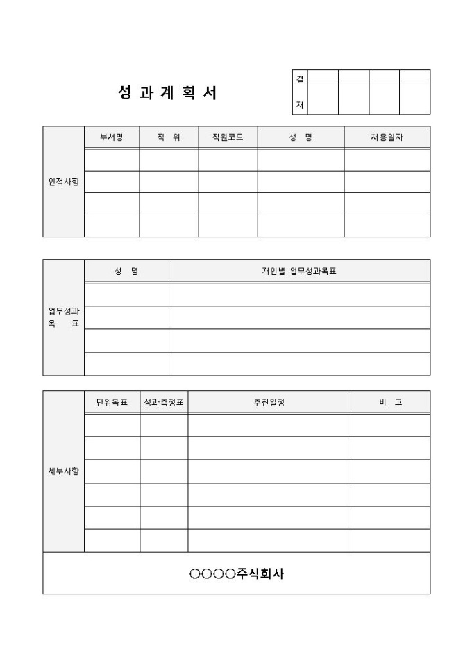 9,000원/월성과계획서 입니다. 부서명, 직위, 직원코드, 채용일자, 업무성과목표, 개인별 업무성과목표, 단위목표, 성과측정표 등으로 구성되었습니다. 업무성과 목표를 작성하고 그것을 실행할 세부사항 구상에 용이합니다.