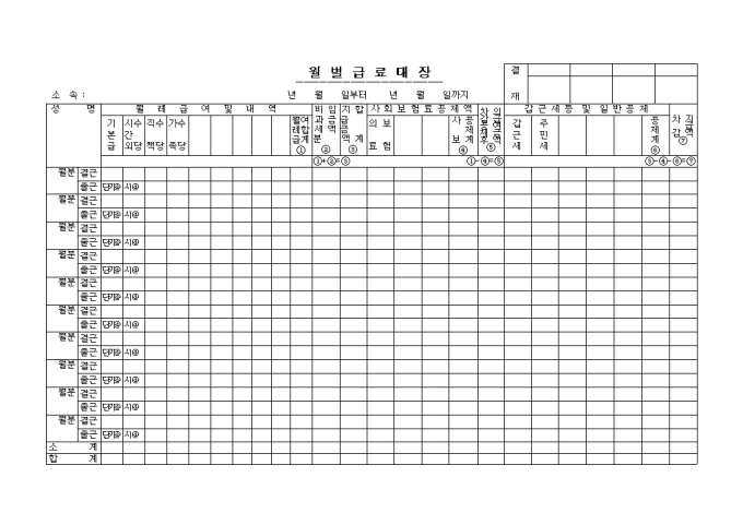 9,000원/월결근, 출근체크를 하여 월례급여 및 내역과 공제액 내역이 있는 월별급료대장입니다.