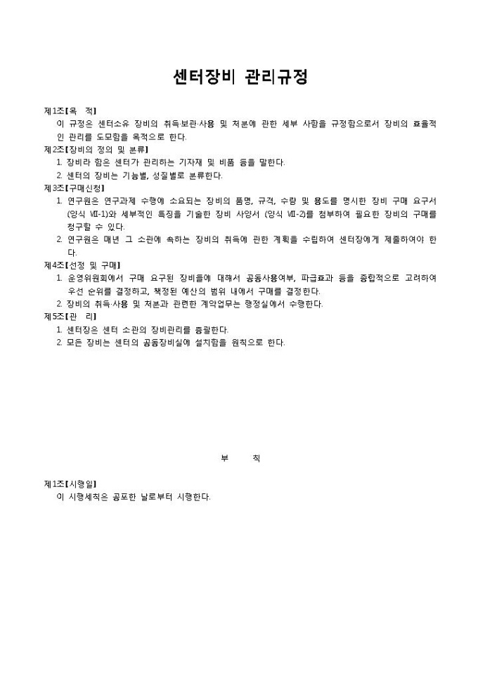 센터장비 관리규정입니다. 센터장비에 대한 규정 내용으로 구성되어 있습니다. 센터소유 장비의 취득, 보관, 사용 및 처분에 관한 세부 사항을 규정하여 장비의 효율적인 관리를 위해 관리규정으로 작성하여 사용할 수 있습니다.