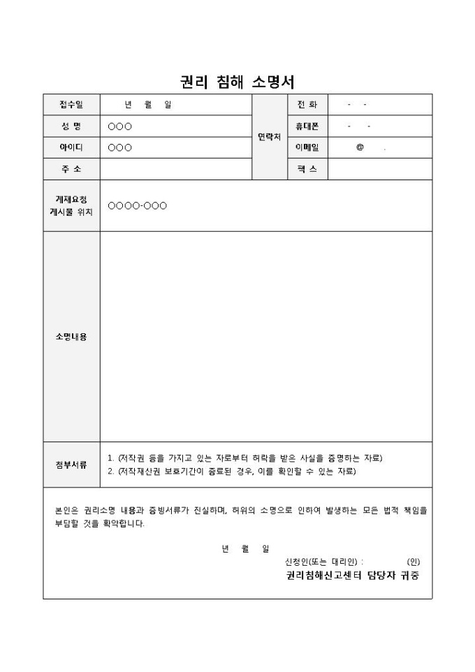 권리를 침해당했을 때 사용되는 소명서 양식입니다. 접수일, 작성자의 인적사항, 소명내용, 첨부서류 등의 항목으로 구성되어 있습니다.