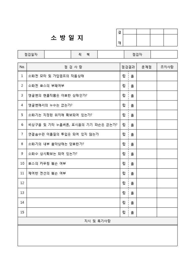 소방일지 입니다. 점검일자, 직책, 성명, 점검사항, 점검결과, 조치사항 등으로 구성되었습니다. 항목별 점검 및 특이사항을 작성하여 업무보고하는데 편리한 양식입니다.