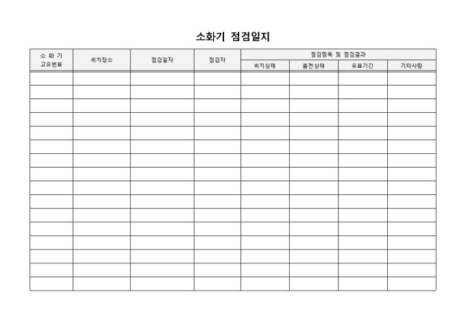 9,000원/월소화기 점검일지 입니다. 고유번호, 비치장소, 점검일자, 점검자, 점검항목 및 결과로 구성되었습니다. 점검일자별 점검자 및 점검사항 작성에 편리한 양식입니다.