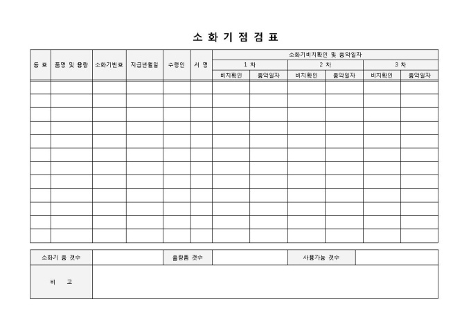 9,000원/월소화기점검표 입니다. 동호, 품명 및 용량, 소화기번호, 지급년월 등으로 구성되었으며, 불량품 및 사용가능 개수 파악에 용이합니다.