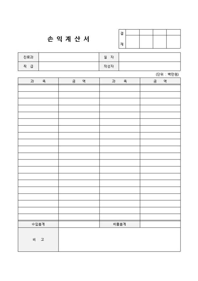 9,000원/월손익계산서 입니다. 진료과, 직급, 일자, 과목, 금액 등으로 구성되었습니다. 과목별 금액 산출 및 특이사항 작성에 효과적입니다.