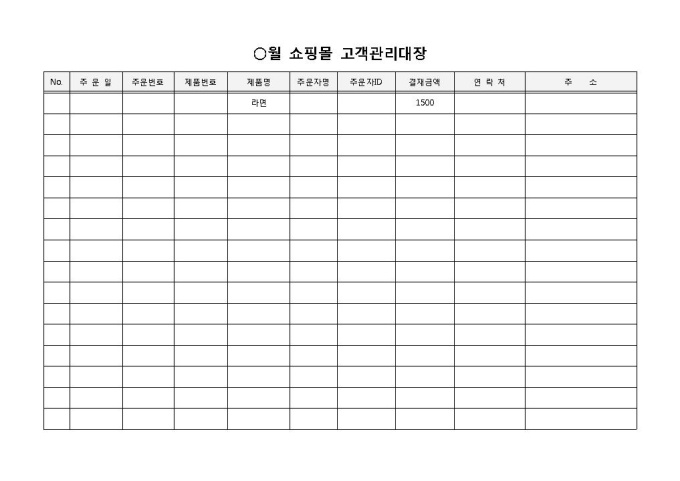 쇼핑몰 고객관리 입니다. 주문일, 주문번호, 제품번호, 제품명, 주문자, 주문자ID로 구성되었습니다. 주문자자의 세부사항과 물품명 확인에 용이합니다.