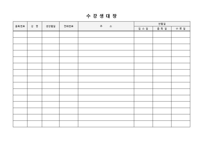 수강생대장 입니다. 등록번호, 성명, 주민등록번호, 전화번호, 주소 등으로 기록되었으며, 수강생의 입소일 및 퇴소일, 수료일 확인에도 용이합니다.