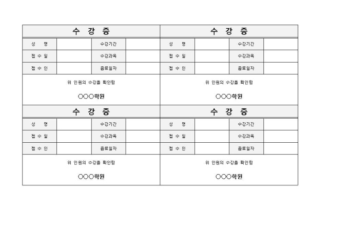 9,000원/월수강증 입니다. 성명, 접수일, 수강기간, 접수인, 종료일자 등으로 구성되었습니다. 수강증 제작 및 관리에 용이합니다.