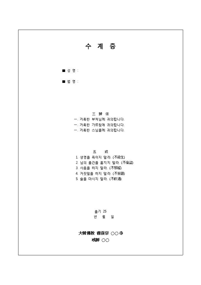 9,000원/월종교에서 사용되는 수계증 양식입니다. 성명, 법명, 날짜 등의 항목으로 구성되어 있습니다.